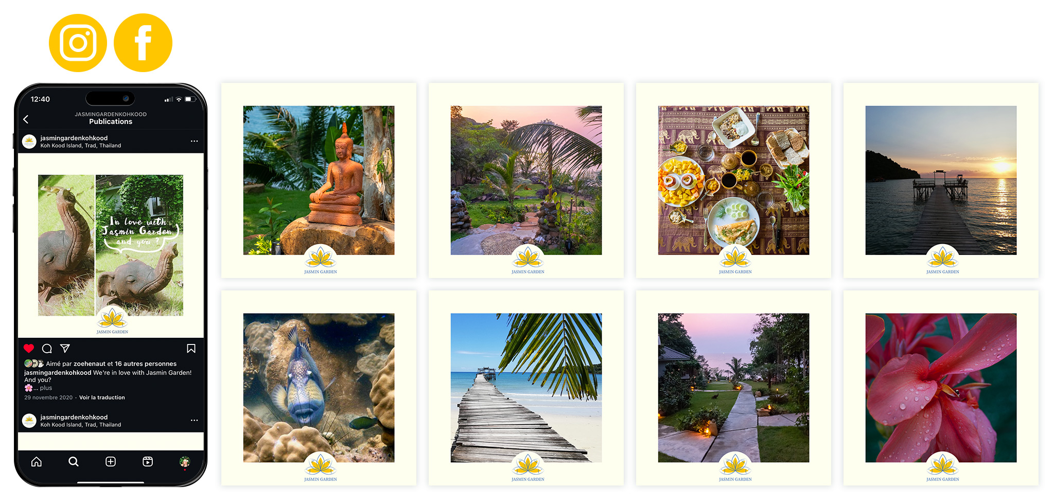 Creation of the visual identity of a luxury hotel in southern Thailand. My client constructed four bungalows and a restaurant. I managed all their communication tools and also photo shoot (website, Google my business page, booking page, Facebook page etc.). Keywords: jasmin, zen, authentic, sea, fish, quality, paradise, garden.