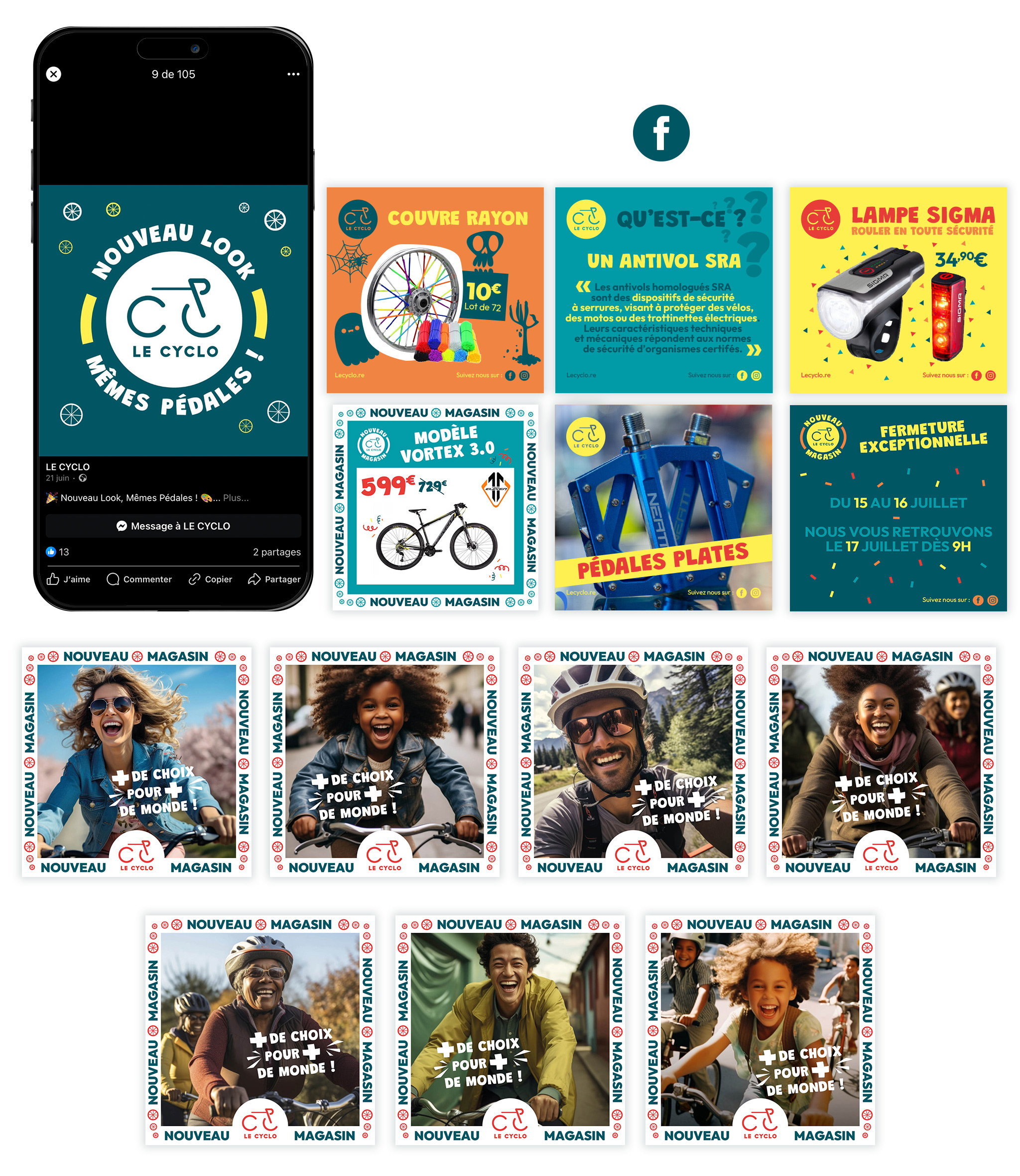 "Le Cyclo" is a bicycles company. They asked my partner (Isabelle Fargier, digital marketing expert) and me to refresh all their brand and to propose interior design for their new shop. We also did a digital opening campaign for this new shop in July 2024.